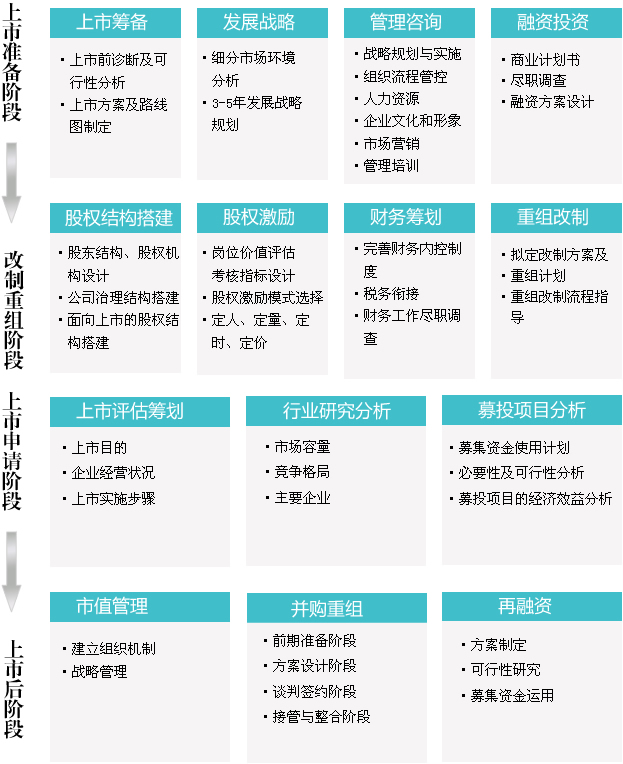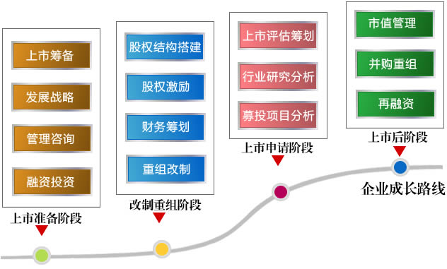 • 上市后服務(wù):上市后再融資及并購咨詢 海外并購咨詢 市值管理
