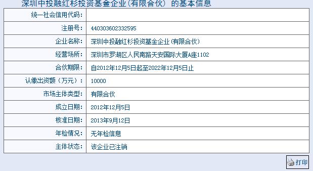 發(fā)行1億元專項基金, 深圳中投融紅杉投資基金企業(yè)(有限合伙),投資建立紅豆杉產(chǎn)業(yè)基地,期限為一年。